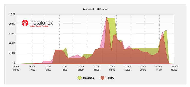 На графике приведен баланс реального торгового счета 2065757. За первые две недели июля была получена прибыль в более чем миллион долларов, баланс достинг отметки 1162092.49 USD при начальном депозите в тысячу с небольшим долларов. Вторые 2 недели июля оказались менее удачными для клиента, приведя к полной потере миллионной прибыли.